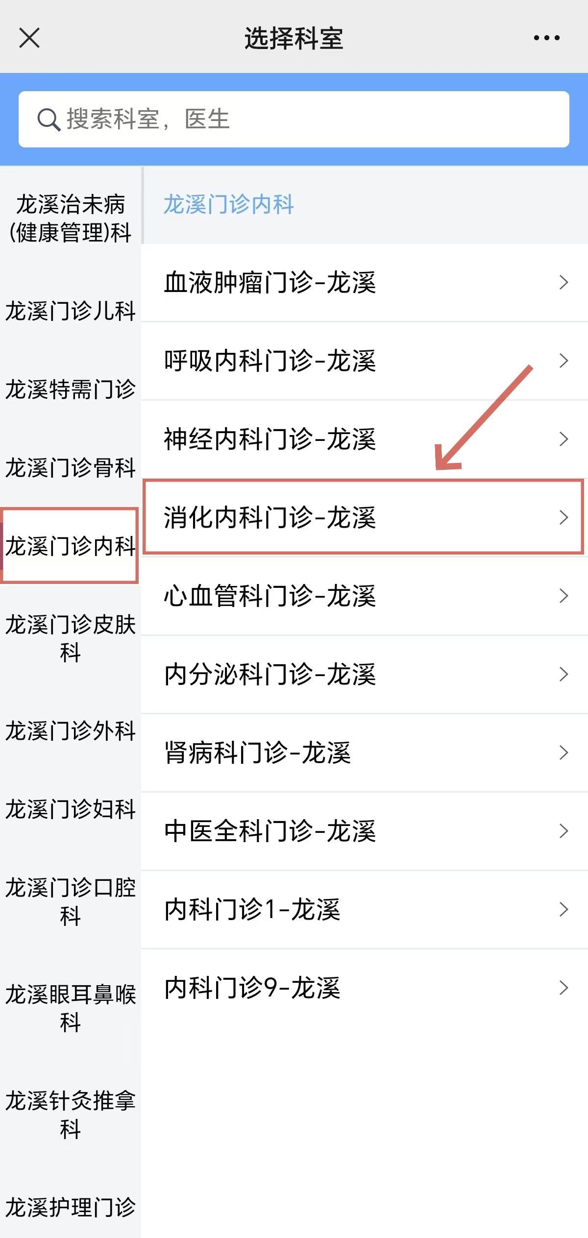 (5)选择“龙溪门诊内科”——“消化内科门诊-龙溪”,即可选择医生挂号
