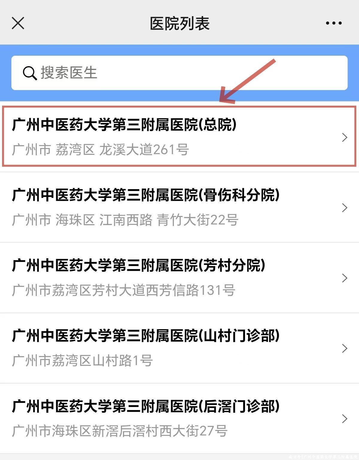(3)选择“广州中医药大学第三附属医院(总院)”